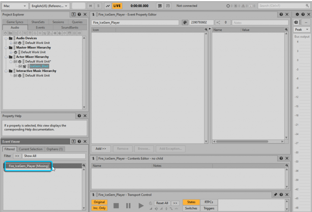 - Using Action, click on the Fire_IceGem_Player [Missing] event in the Event Viewer. This will open the Fire_IceGem_Player – Event Property Editor and display two blank panes. Here, specify the Action to occur when Wwise receives the Fire_IceGem_Player event from the game engine.