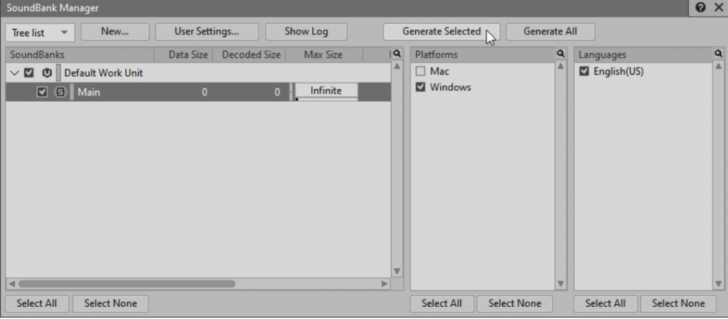 Click OK to close the SoundBanks Settings window, then click the Generate Selected or Generate All button in the SoundBank Manager.