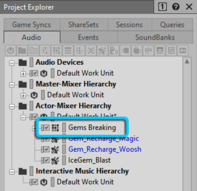 - Importing sound: In the Project Explorer view, select the Audio option. We need to place the sound in the Work Unit under the Actor-Mixer Hierarchy.